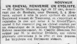 M. Camille Monceau, âgé de 17 ans, demeurant rue de Roubaix, cour Desmet, 1, à Mouvaux, suivait à vélo la piste cycliste du Grand Boulevard venant de Tourcoing, et s’apprêtait à rejoindre la rue qui mène à la Grand’Place, quand il fut renversé par un cheval conduit par un domestique de a maison Tiberghien-Pollet. Relevé immédiatement, M. Camille Monceau fut soigné par M. le docteur Deldalle, qui releva plusieurs contusions à la tête et aux genoux.