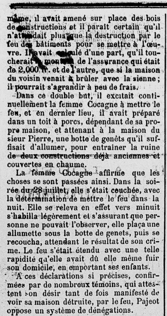 En consultant la presse ancienne, je découvre également que Clotilde a été condamnée « à la peine de 8 ans de travaux forcés et aux frais » pour un incendie volontaire. Son complice et amant, Juste Pierre Pageot, a été acquitté. (Cf. Extrait ci-dessous)