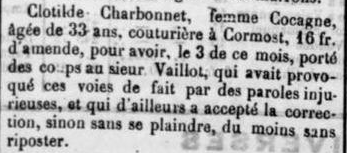 En janvier 1873, dans la commune de Cormost, une scène cocasse se joue : Clotilde Charbonnet, couturière de 33 ans, est condamnée à 16 francs d’amende pour avoir « porté des coups » à un certain monsieur Vaillot. Pourquoi ? Des paroles injurieuses. Ce fait divers a fait l’objet d’un encart dans le journal « L’Aube » du 18 janvier 1873.