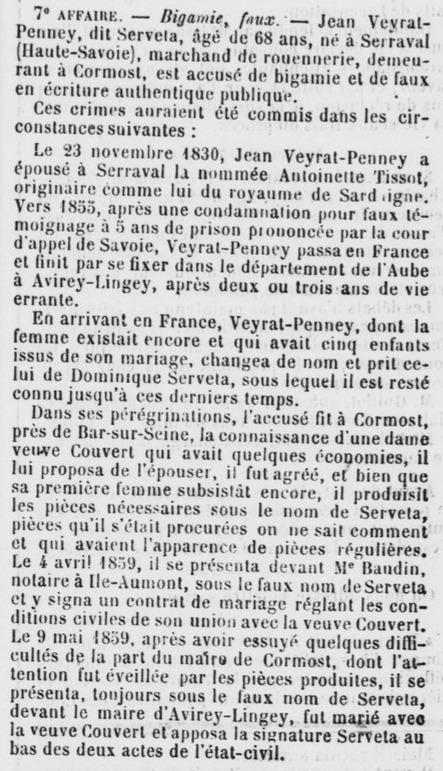 Dans l’article, on apprend rapidement la véritable identité de ce monsieur Serveta, Jean Veyrat-Penney, agé de 68 ans et né à Serraval (Haute-Savoie), le 20 juin 1800, fils de Claude et de Jeanne Marie Tissot. Il épouse en première noce Jeanne Sallier (le 11 septembre 1821 à Serraval) et en seconde noce Antoinette Tissot (le 23 novembre 1830 aussi à Serraval).