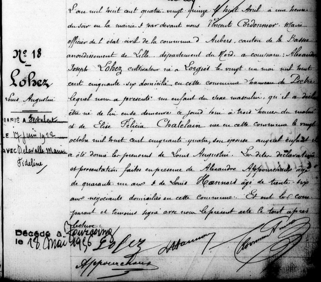 Effectivement, en date du 8 avril 1895, je retrouve l’acte de naissance n° 18 de Louis Augustin LOHEZ, né le jour même à 3 heures du matin. La déclaration est faite par son père, Alexandre Joseph LOHEZ, cultivateur, né le 21 mai 1856 à Lorgies (Pas-de-Calais). Et sa mère est Elise Félicia CHATELAIN, né le 20 octobre 1854 à Aubers.