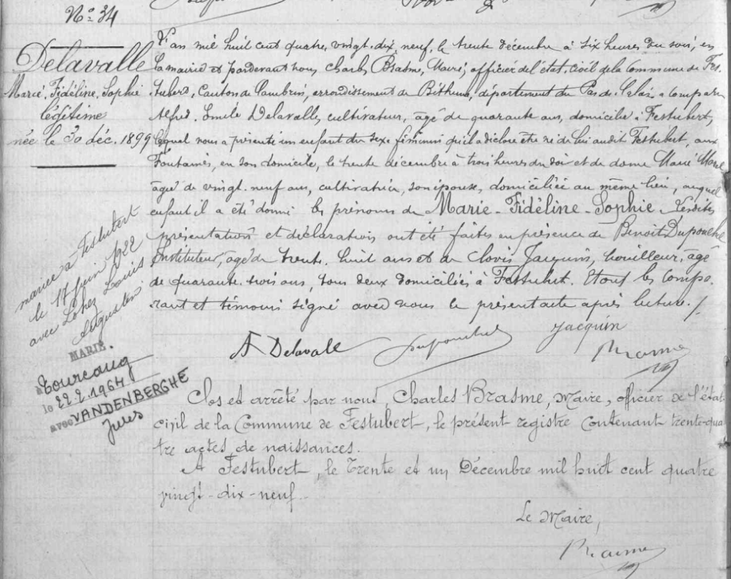 Direction les archives en ligne du Pas-de-Calais pour trouver l’acte de naissance n° 34 au nom de Marie Fidéline Sophie DELAVALLE, née le 30 décembre 1899 à 3 heures du soir (soit 15 heures) à Festubert (Pas-de-Calais). Son père est Alfred Émile DELAVALLE et sa mère Marie MOREL.