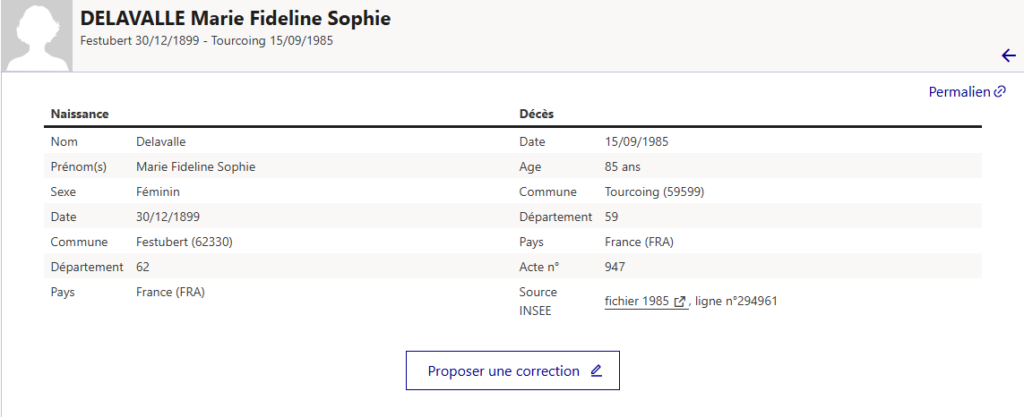 Pour Marie Fidéline Sophie DELAVALLE, je tente une nouvelle fois la consultation des fichiers des décès de l’INSEE et trouve la date et le lieu de décès : le 15 septembre 1985 à Tourcoing (Nord)