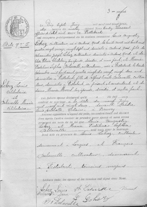 Suite aux renseignements trouvés sur les actes de naissance, je me suis directement rendu dans les archives du Pas-de-Calais pour récupérer à la date du 17 juin 1922, l’acte de mariage n° 5 sur la commune de Festubert (Pas-de-Calais), commune de naissance de la mariée.
